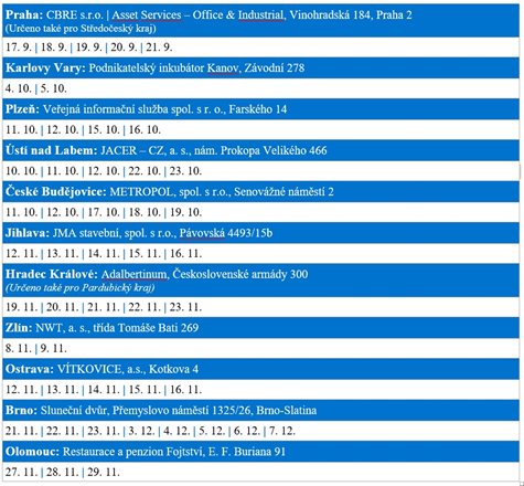 Jednodenní semináře (9:00 – 15:00) pro skupiny max. 15 účastníků se od září do prosince 2018 uskuteční ve většině krajských měst České republiky, a to s následujícím obsahem a v následujících termínech: