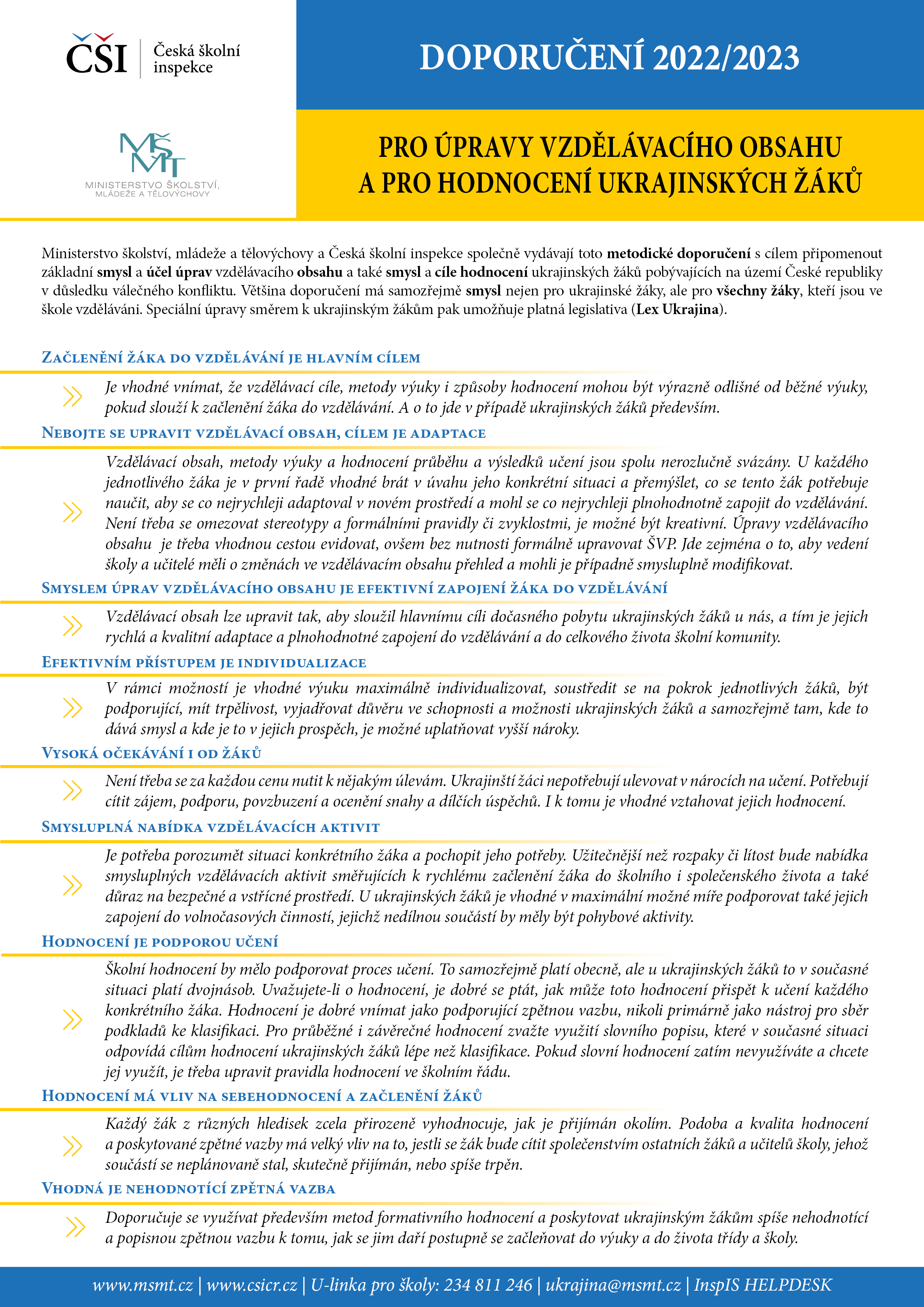 Ministerstvo školství, mládeže a tělovýchovy a Česká školní inspekce společně vydávají toto metodické doporučení s cílem připomenout základní smysl a účel úprav vzdělávacího obsahu a také smysl a cíle hodnocení ukrajinských žáků pobývajících na území České republiky v důsledku válečného konfliktu. Většina doporučení má samozřejmě smysl nejen pro ukrajinské žáky, ale pro všechny žáky, kteří jsou ve škole vzděláváni. Speciální úpravy směrem k ukrajinským žákům pak umožňuje platná legislativa (Lex Ukrajina).
